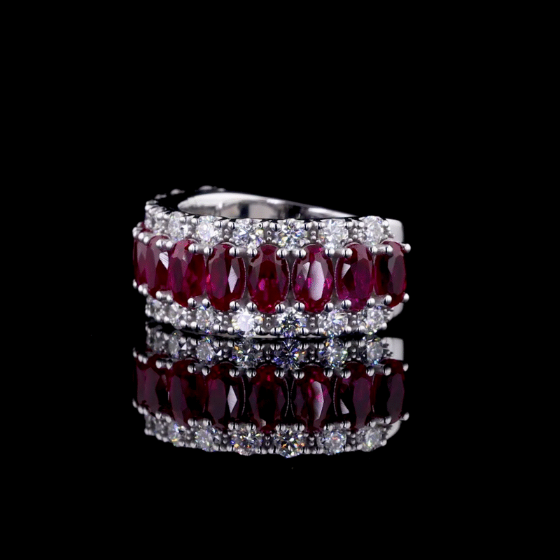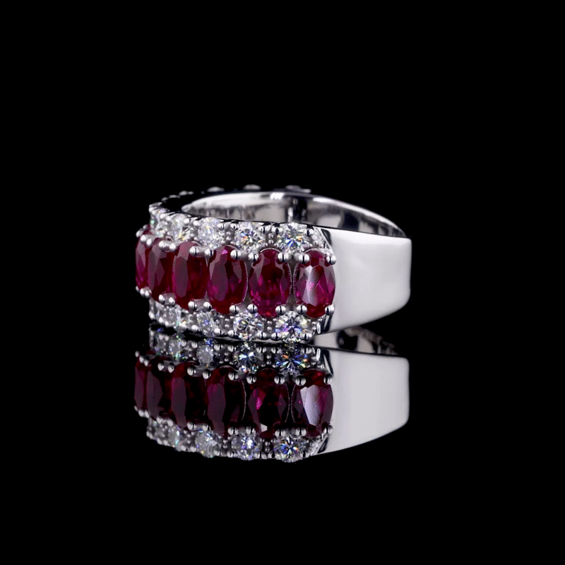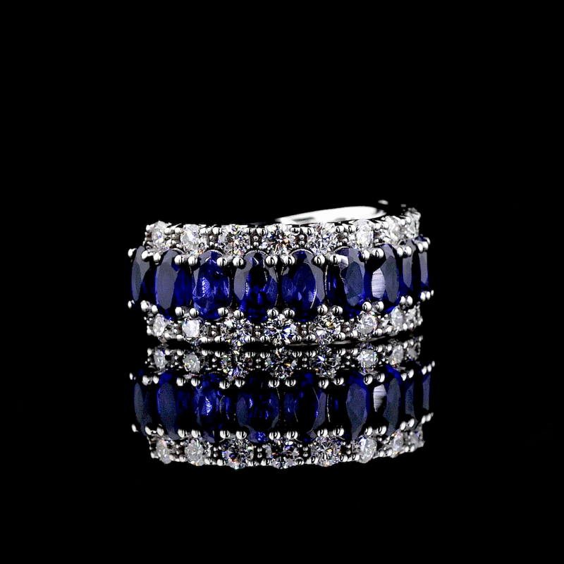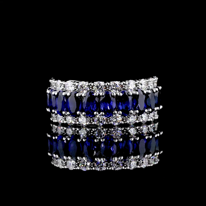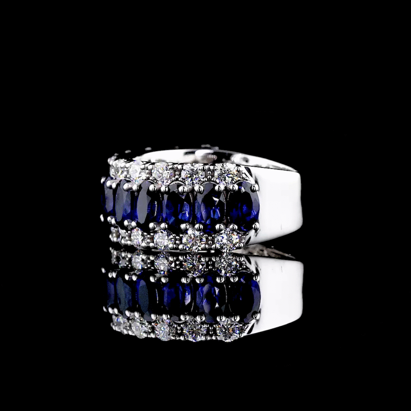 The beauty of this double row band lab grown diamond ring lies in its intentional contrast. The larger, deep-toned oval blue sapphire stones are set alongside a dazzling row of brilliant lab-grown diamonds. This design serves multiple purposes: